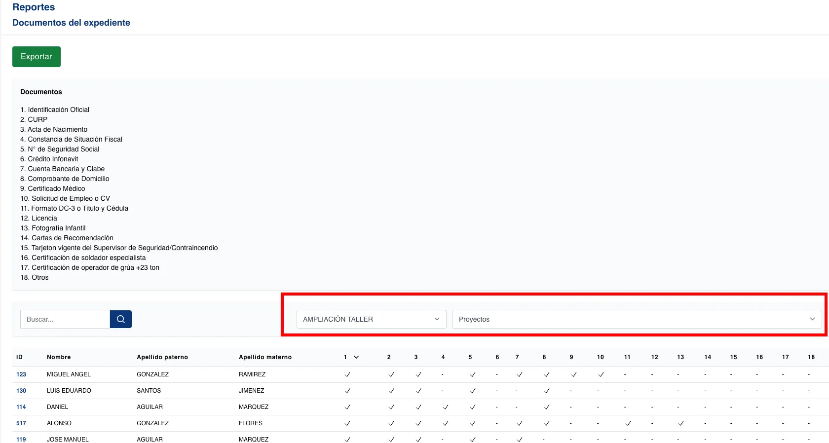Agregué los Filtros por área y proyecto también a los reportes de expediente y contratación, ya que no existían.