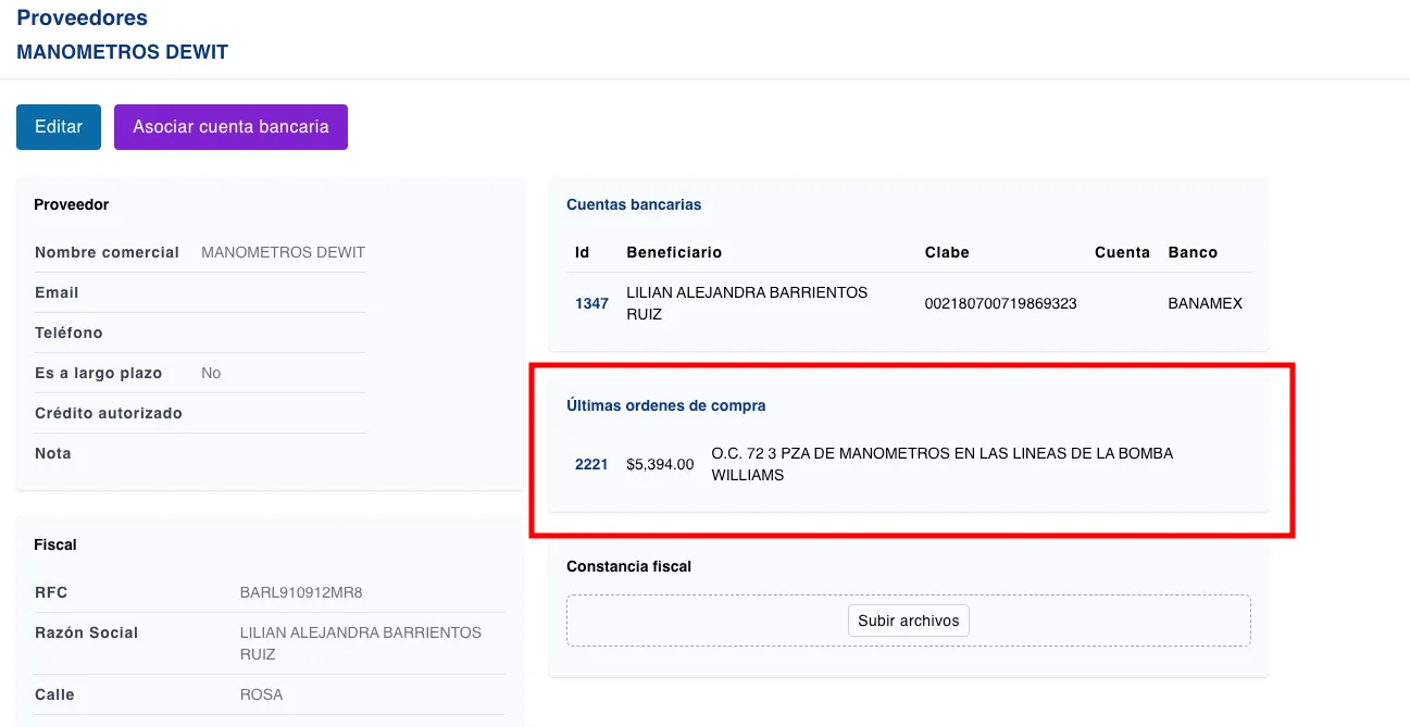 Esta búsqueda no era posible desde el listado de órdenes de compra ya que cada proveedor puede tener varios beneficiarios bancarios.