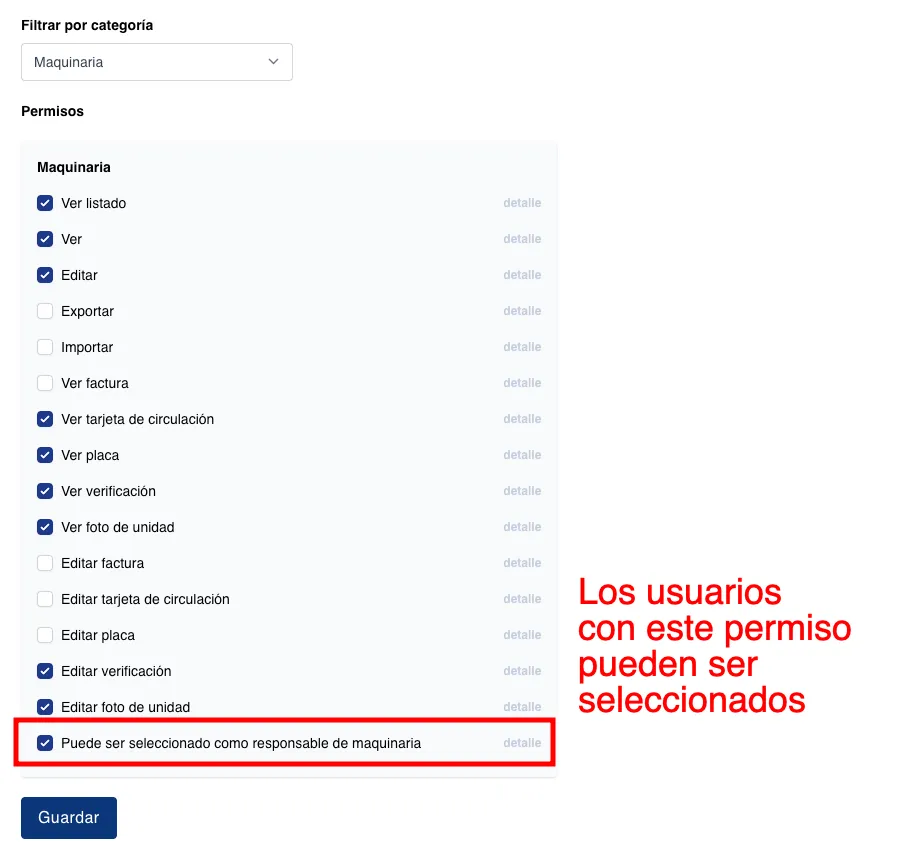 Para que aparezcan los usuarios en este listado hay que agregarles el permiso “Puede ser seleccionado como responsable de maquinaria”
