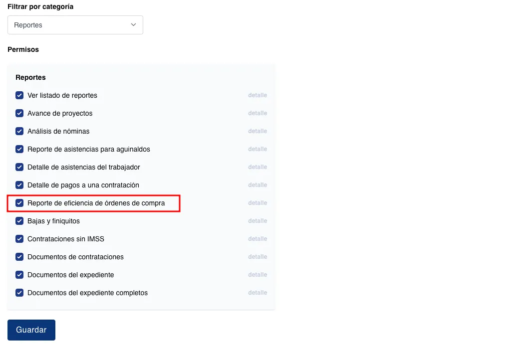 Para que se pueda visualizar este reporte, agregar el permiso “Reporte de eficiencia de órdenes de compra”