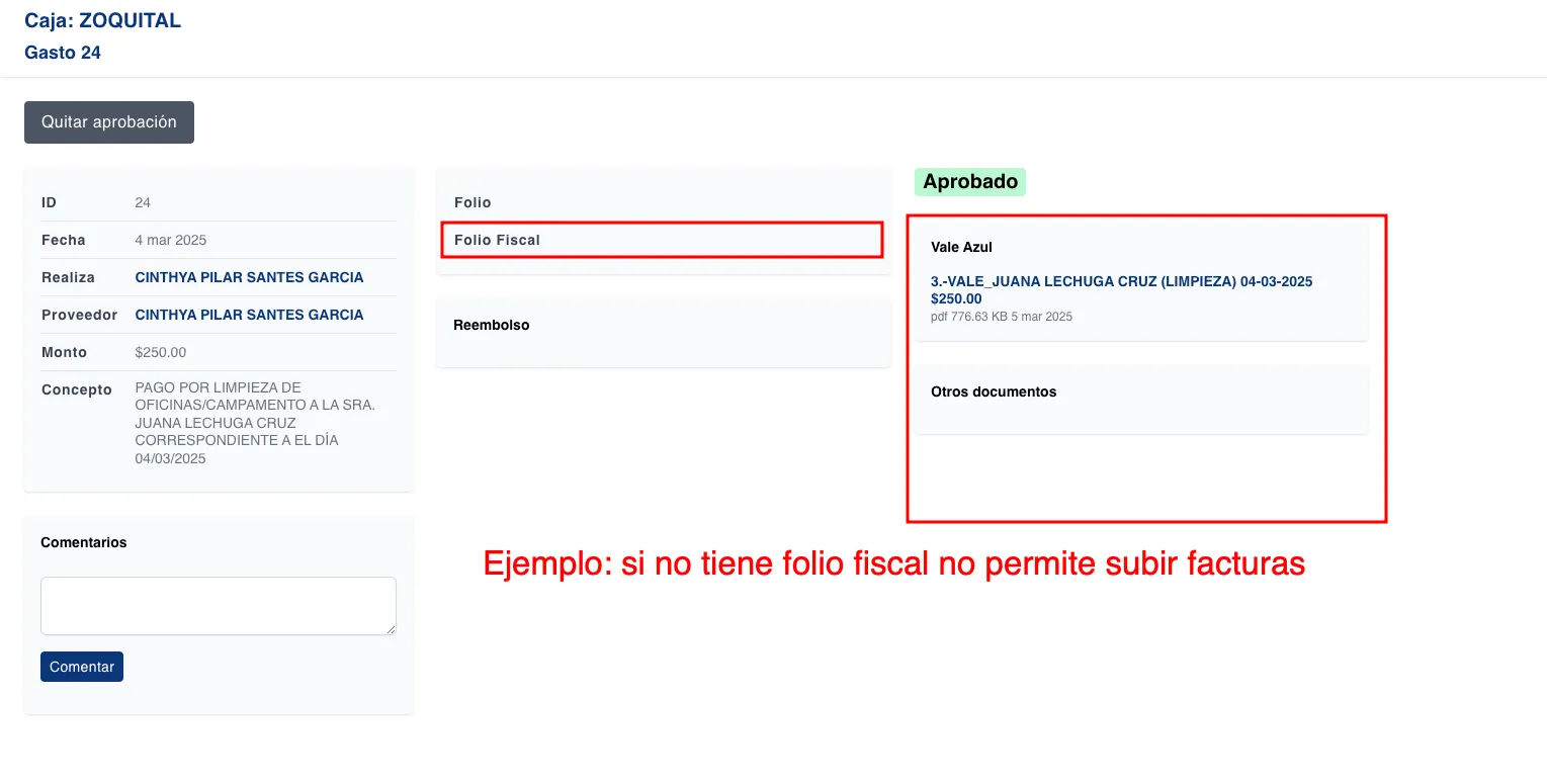 No permite subir el vale azul si hay folio fiscal. Los datos deben ser consistentes