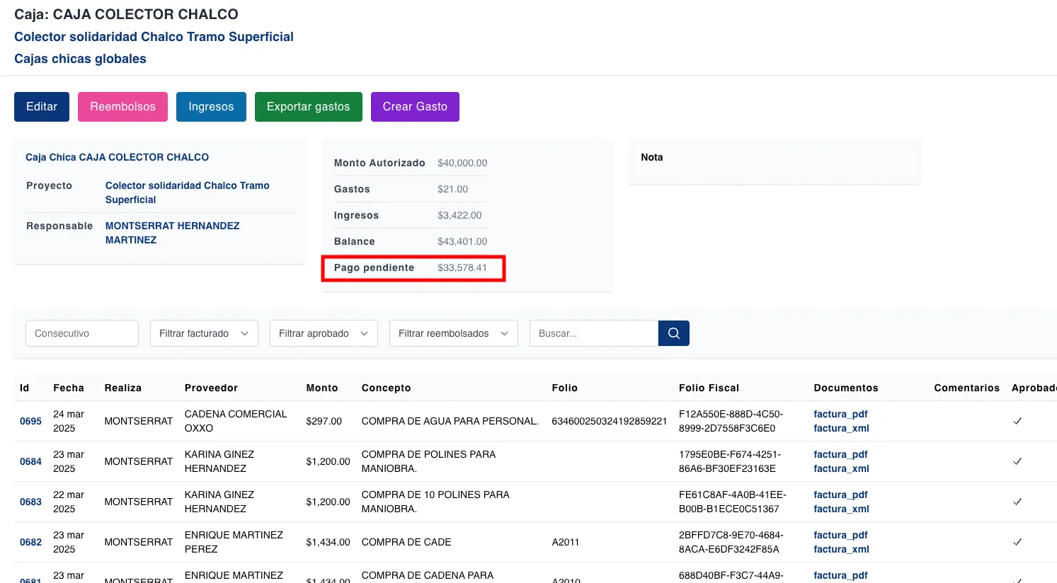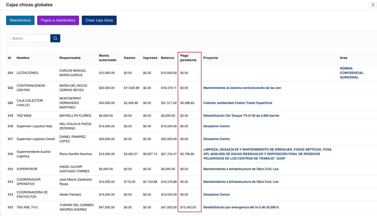 globalmente, finanzas puede ver cuáles cajas tienen pagos en proceso y su monto.