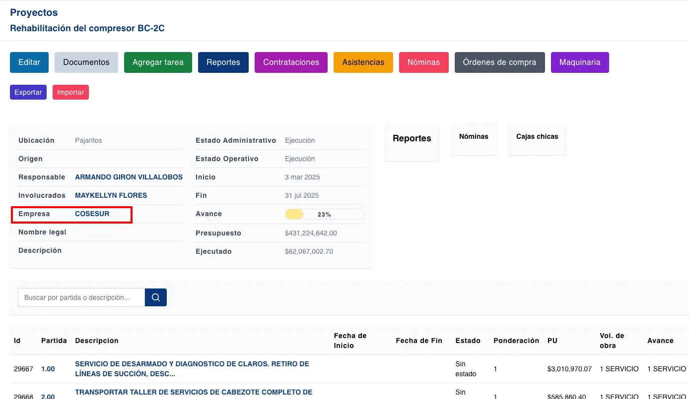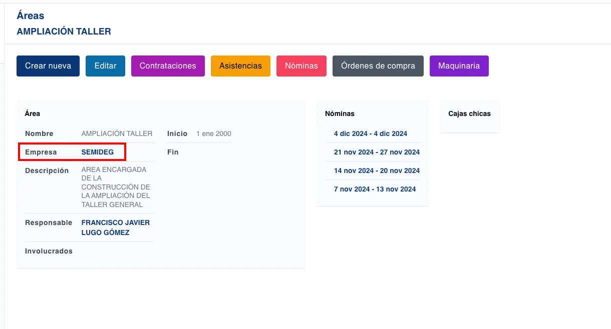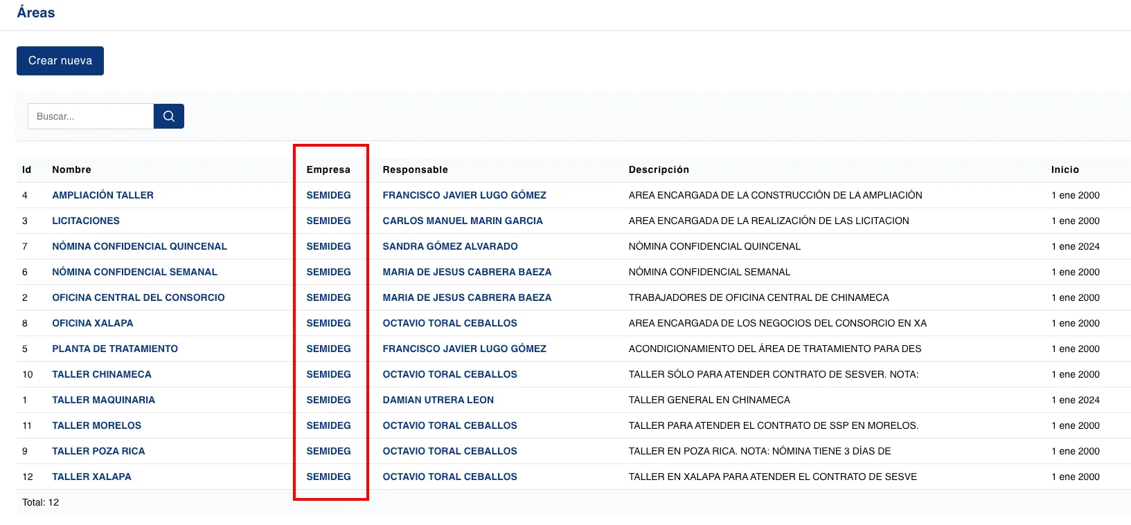 Agregué la columna “empresa” a proyectos y áreas y marqué todas como “Semideg”