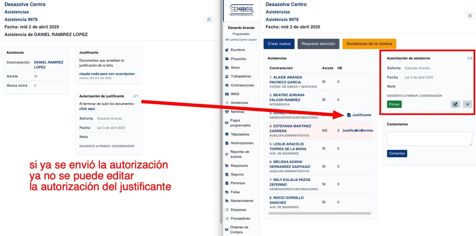 - no se puede borrar la autorización del justificante ya que esa forma parte del proceso previo