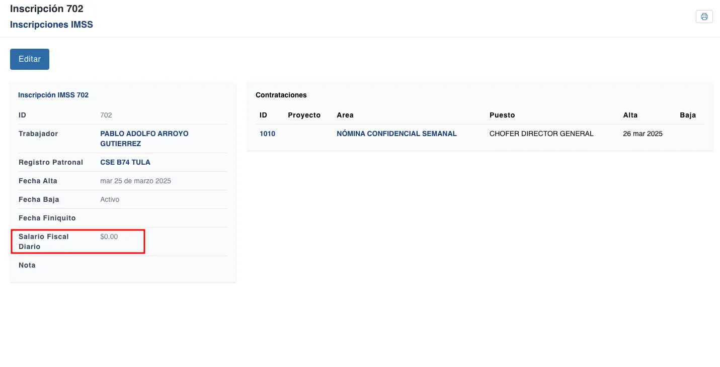 Anteriormente este valor estaba asociado a cada contratación, sin embargo eso no era correcto ya que ese valor debe estar asociado a cada inscripción al IMSS.