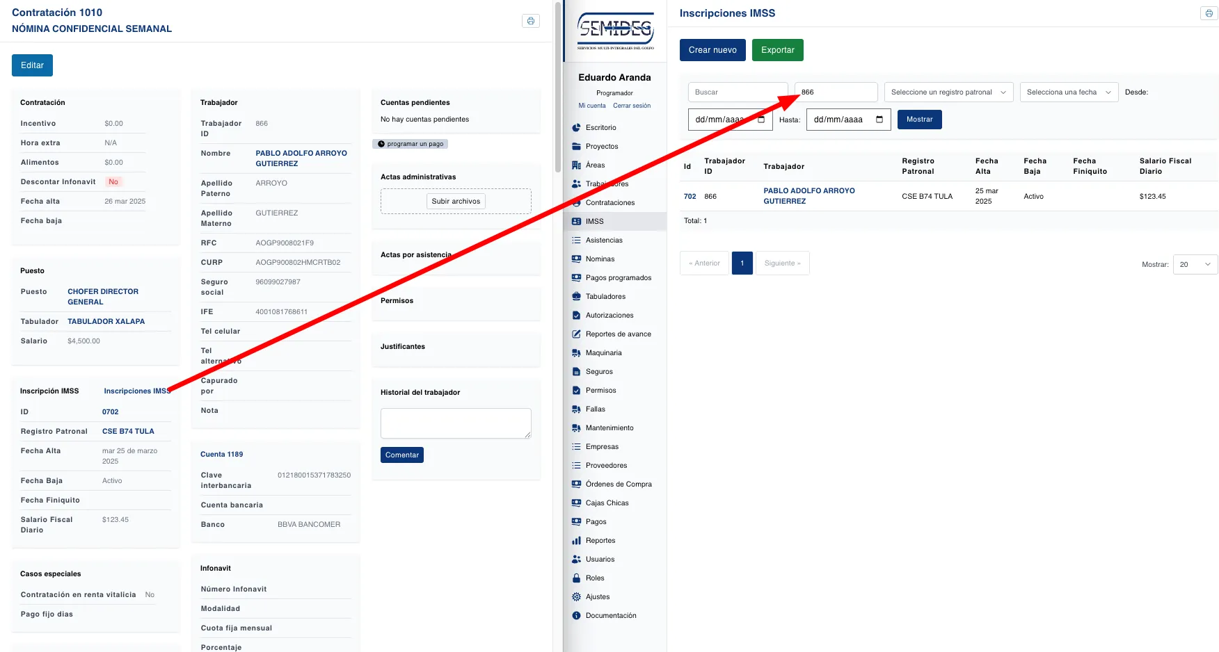 Al hacer click acá, nos ayudará a encontrar las inscripciones al imss del trabajador en un solo click