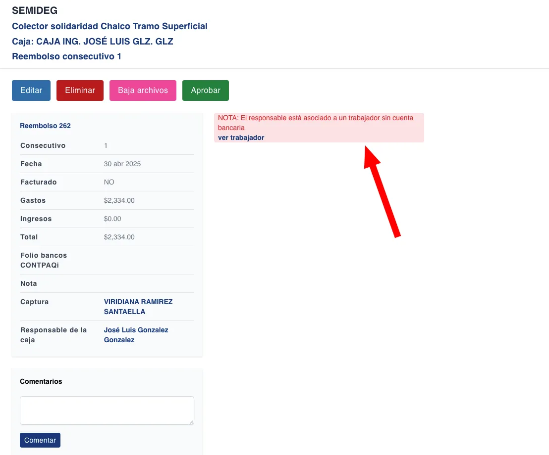 Agregué un mensaje a aclaratorio, en caso de qué las cajas chicas estén asociadas a un trabajador sin cuenta bancaria.