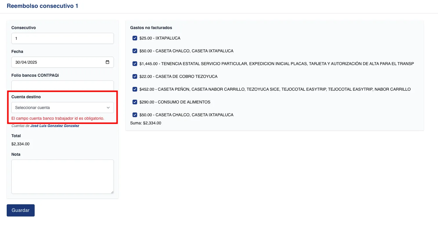 También agregué validaciones para impedir que se guarden en reembolsos sin cuenta bancaria destino.