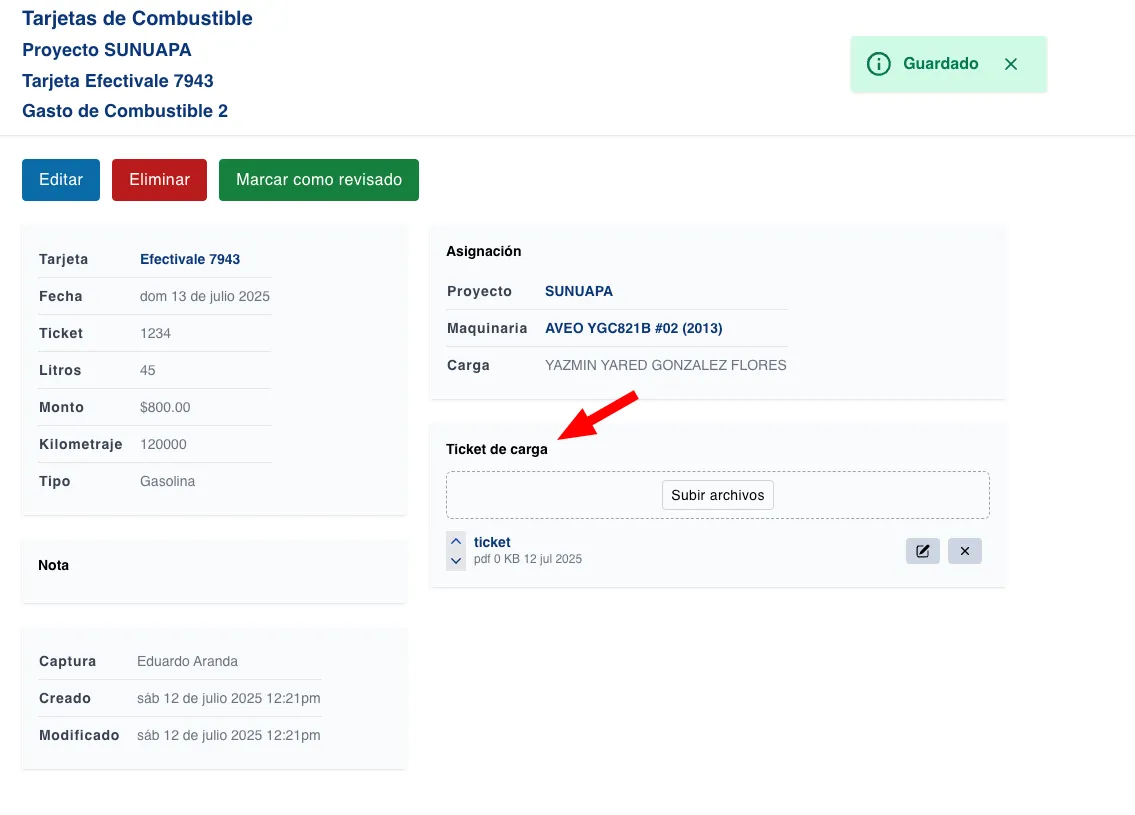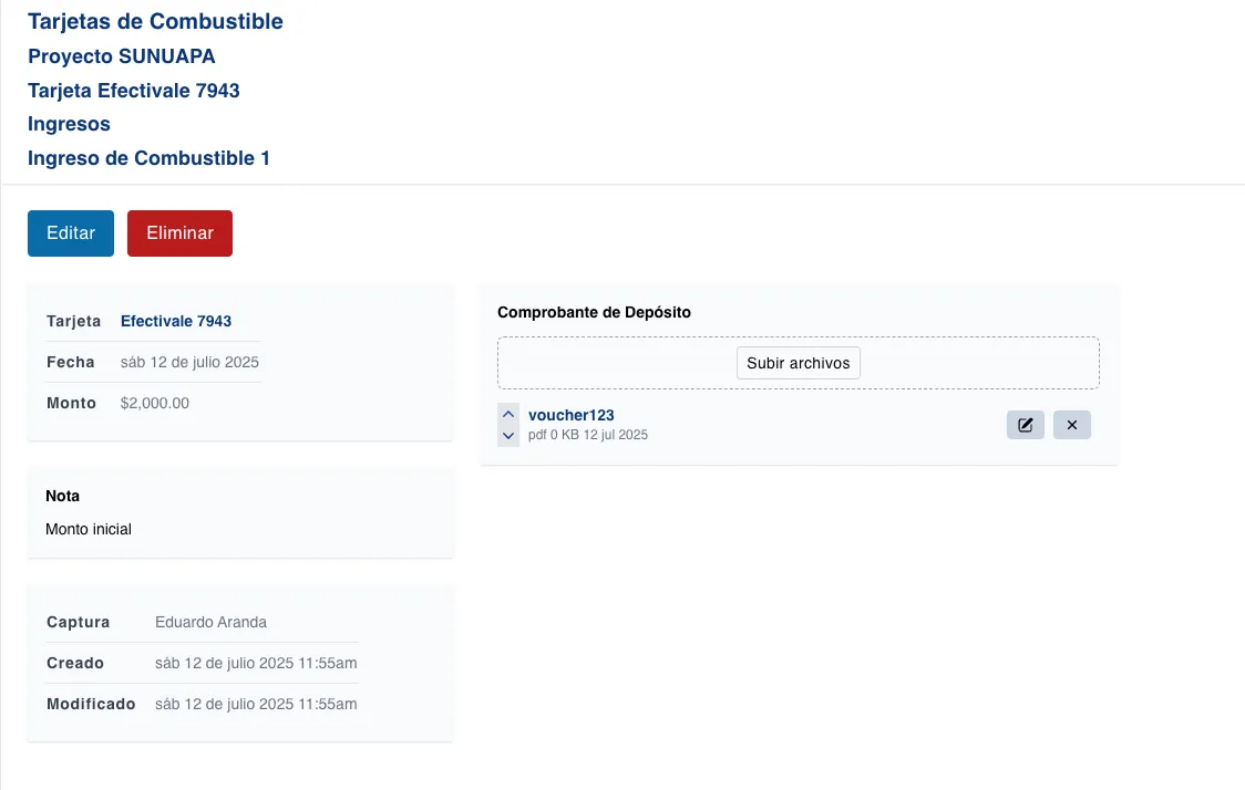 En cuanto a la carga de dinero a las tarjetas, es muy sencillo, Simplemente cargamos un monto, una nota y el comprobante.