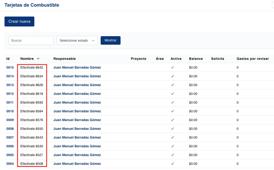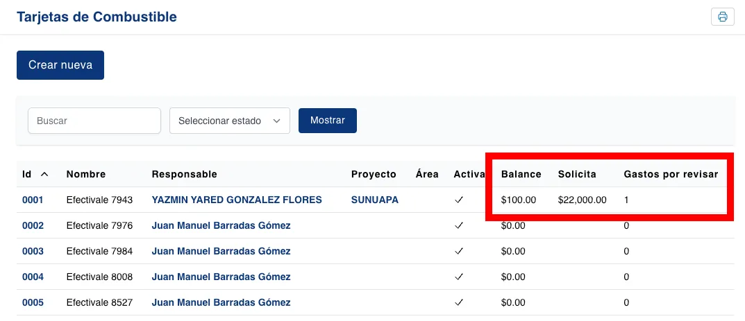 En el estado de tarjetas de combustible podemos ver a la derecha columnas que nos serán de gran utilidad