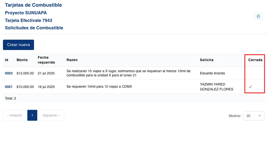 Un detalle importante es que La solicitudes se marcan como cerradas aunque el ingreso de combustible sea distinto al solicitado.