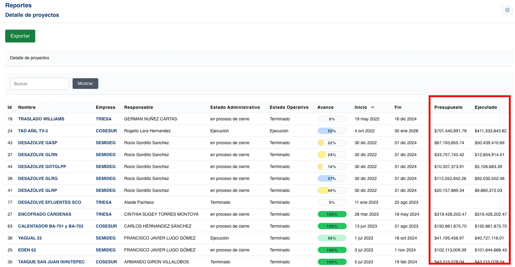 Reporte con el detalle de todos los proyectos del sistema, exportable a excel.